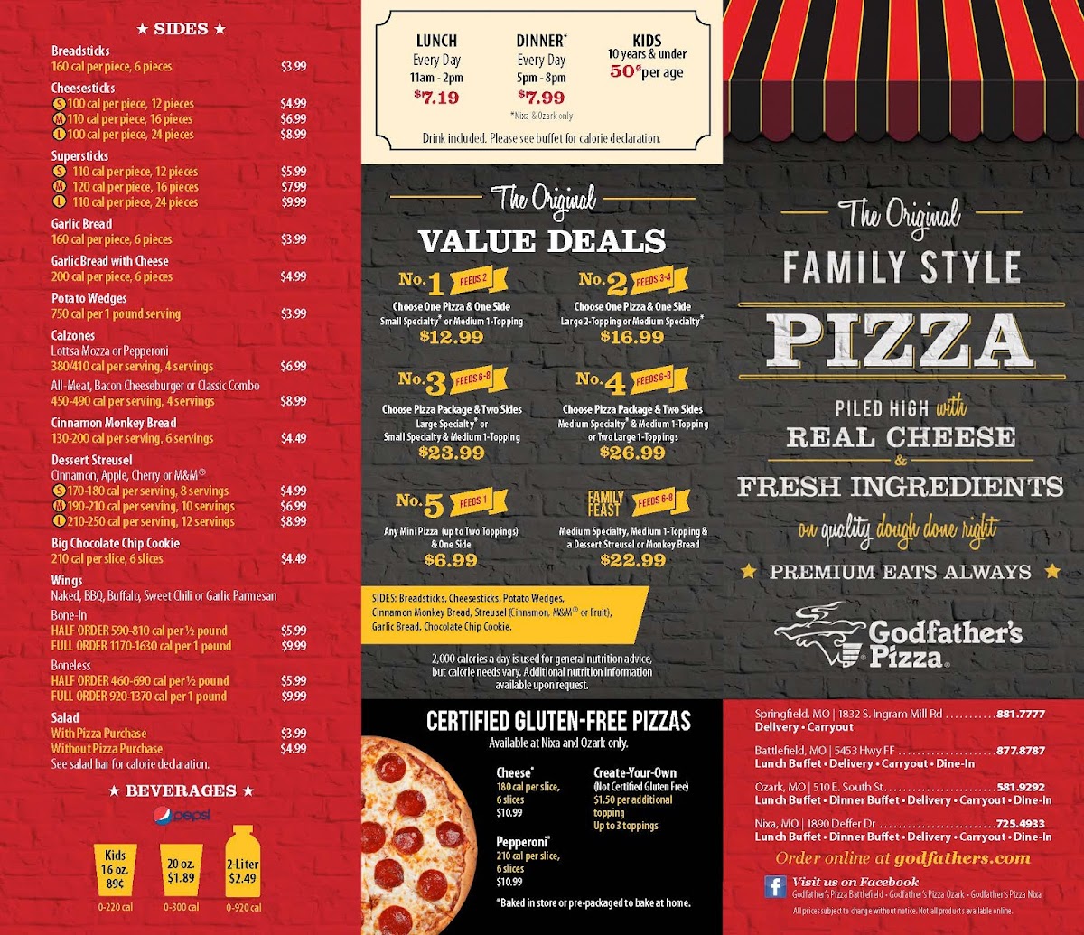 Godfather's Pizza offers a menu that blends classic Italian comfort with casual dining, making it a welcoming spot for both quick meals and relaxed gatherings. The selection includes a variety of pizzas—from customizable builds to thoughtfully crafted specialty options—that can satisfy tastes ranging from simple cheese to hearty meat and veggie combinations.